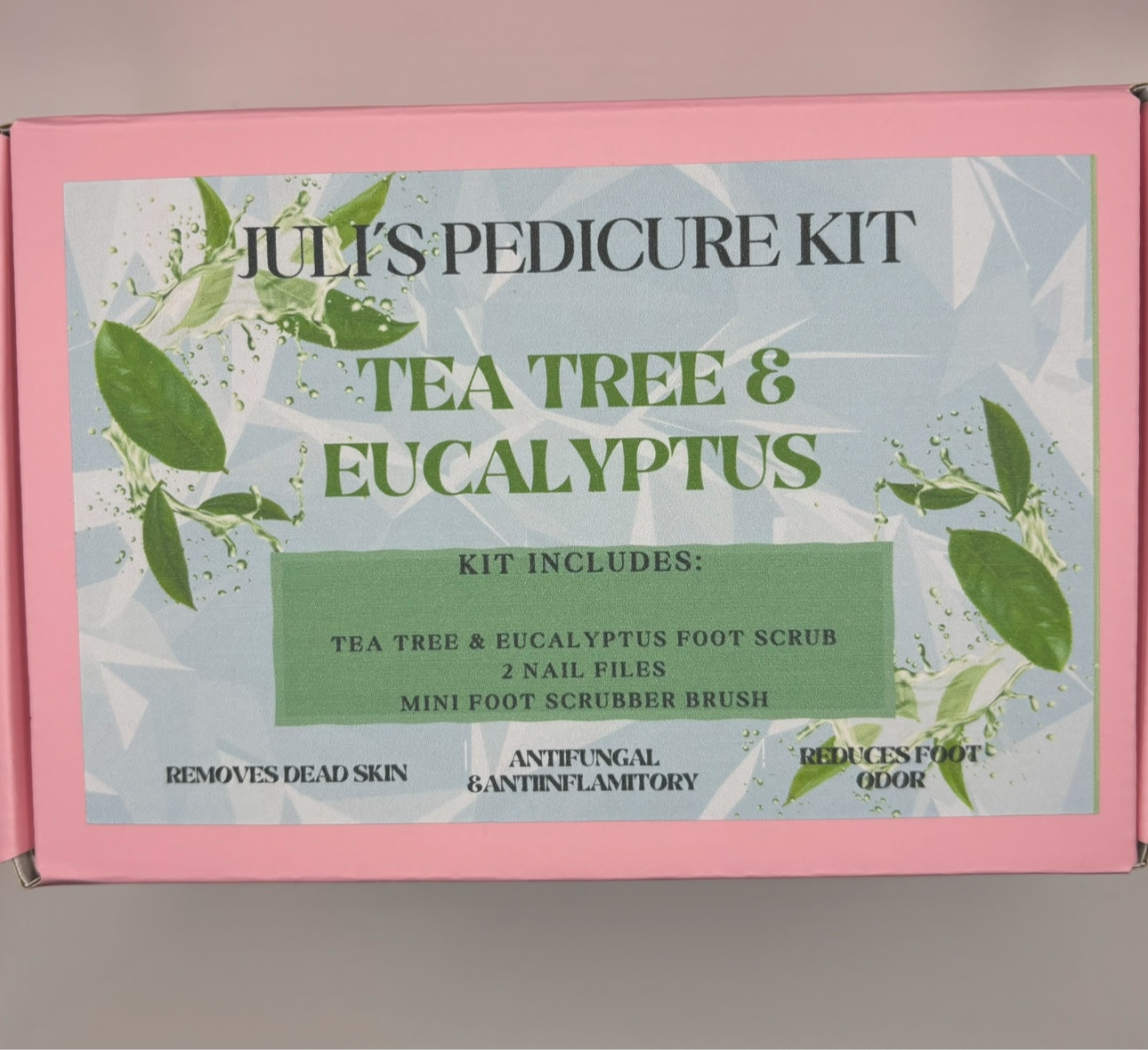 Revitalize your feet with our Tea Tree & Eucalyptus Pedicure Kit, a perfect combination of nature’s best ingredients. This rejuvenating set includes a foot scrub enriched with the purifying power of tea tree oil and the refreshing essence of eucalyptus, working together to cleanse and exfoliate dry, rough skin. The pumice pads effectively smooth and soften calluses, while the nail files help shape and perfect your nails.