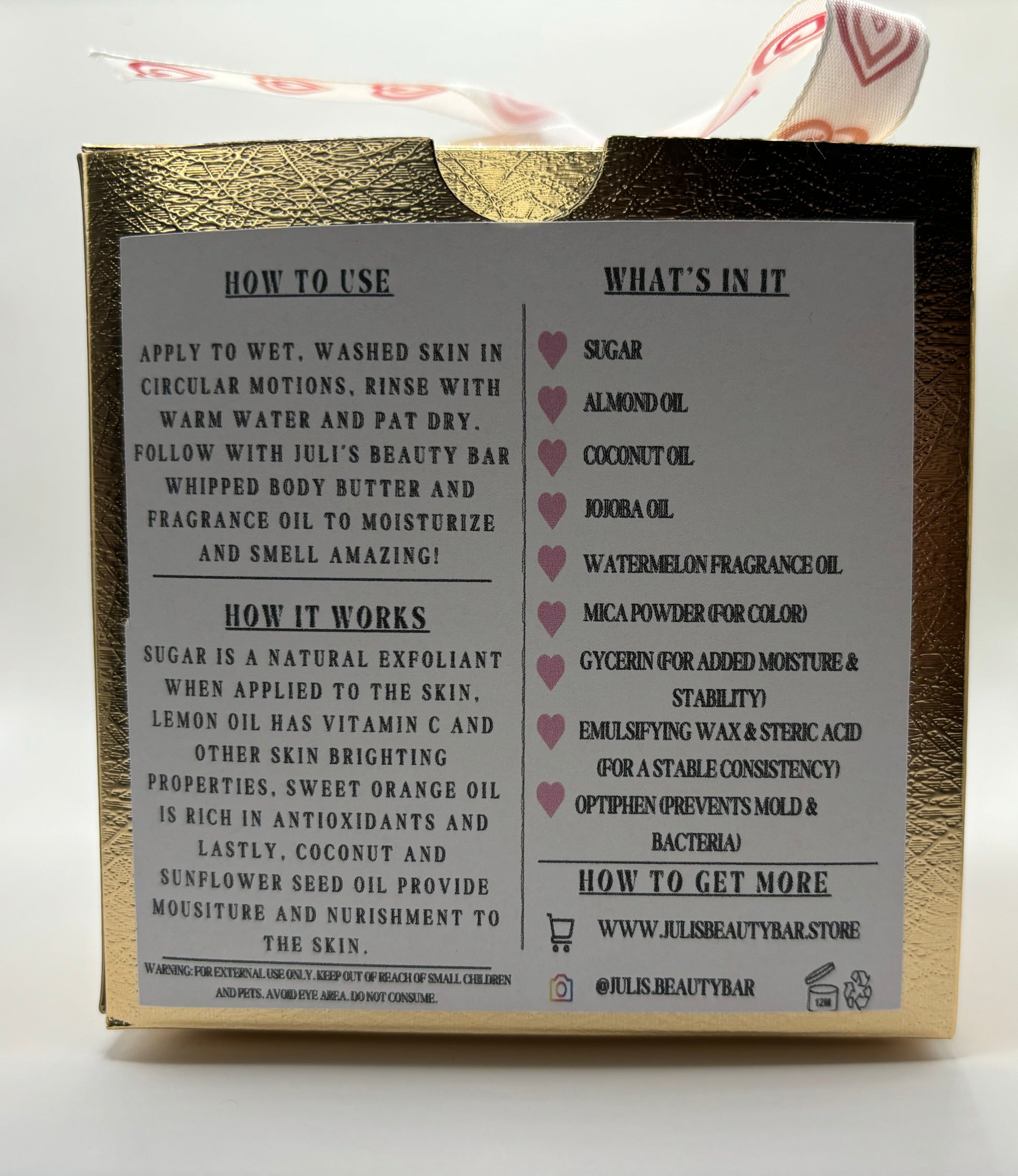 Treat your skin to a refreshing burst of hydration with our Watermelon Body Scrub with Poppy Seeds. This rejuvenating scrub combines watermelon extract's soothing, hydrating power with the gentle exfoliation of poppy seeds to leave your skin feeling soft, smooth, and nourished. The light, fruity fragrance of watermelon adds a refreshing touch. This scrub is your go-to for radiant, deeply hydrated skin!